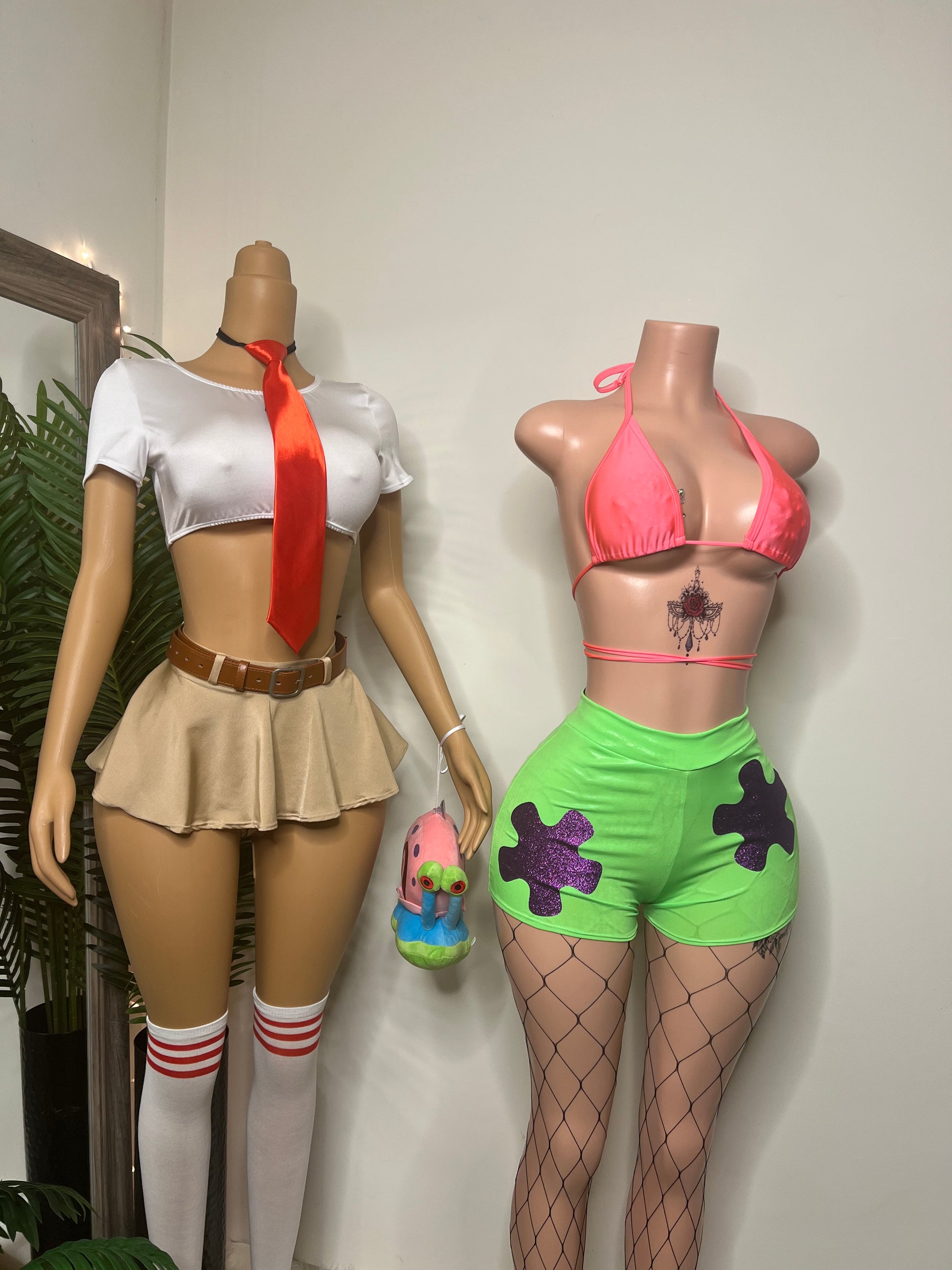 The SpongeBaddie set gives school-girl tease with a cropped white top, satin red tie, and pleated tan mini skirt. The Starfish Bae set keeps things wild with a neon pink halter top, lime-green shorts, and sparkly purple appliqués that shimmer under the lights. Each piece is handmade with premium stretch fabrics for that signature PKT fit — sculpted, flattering, and ready for the spotlight.