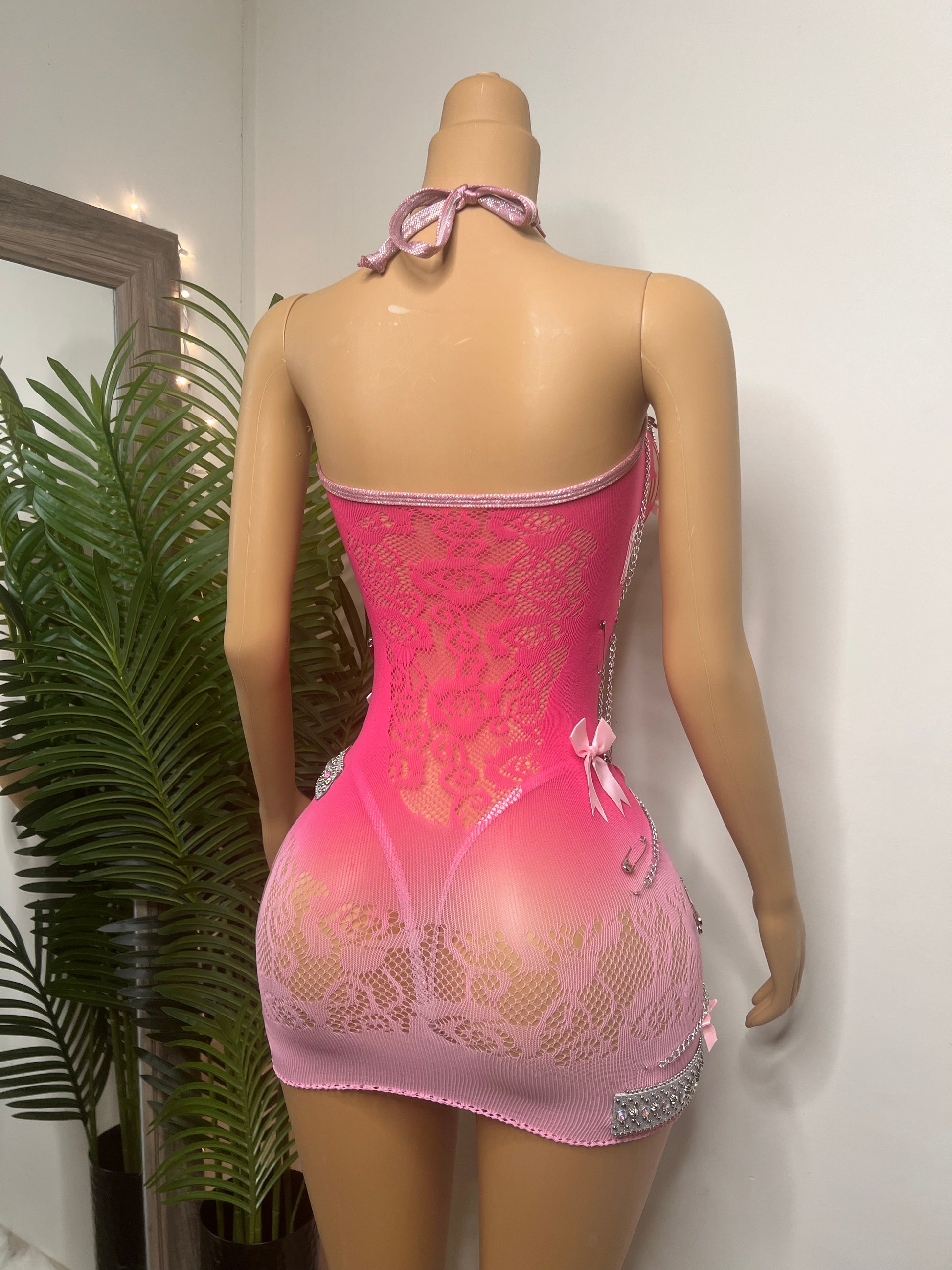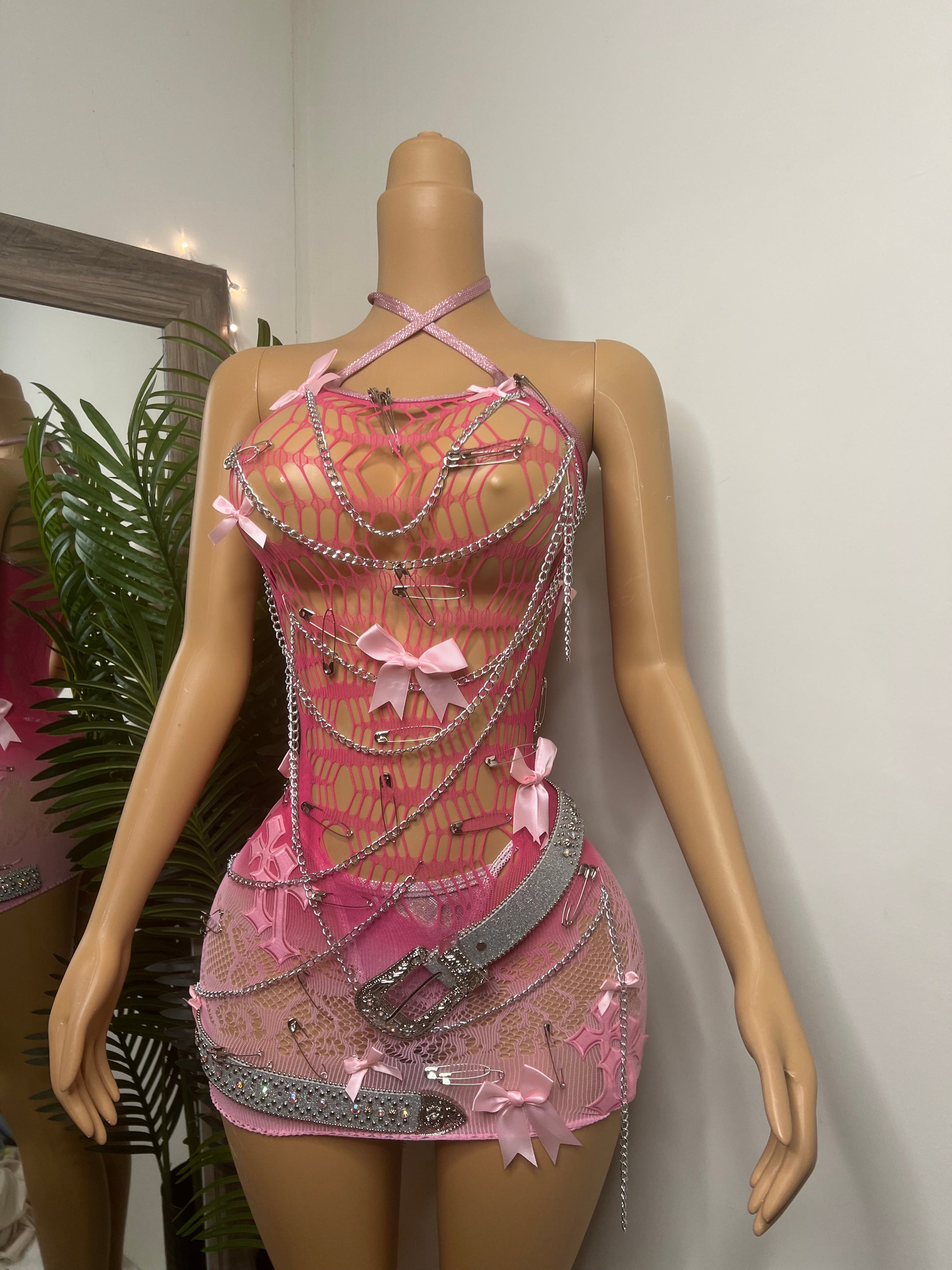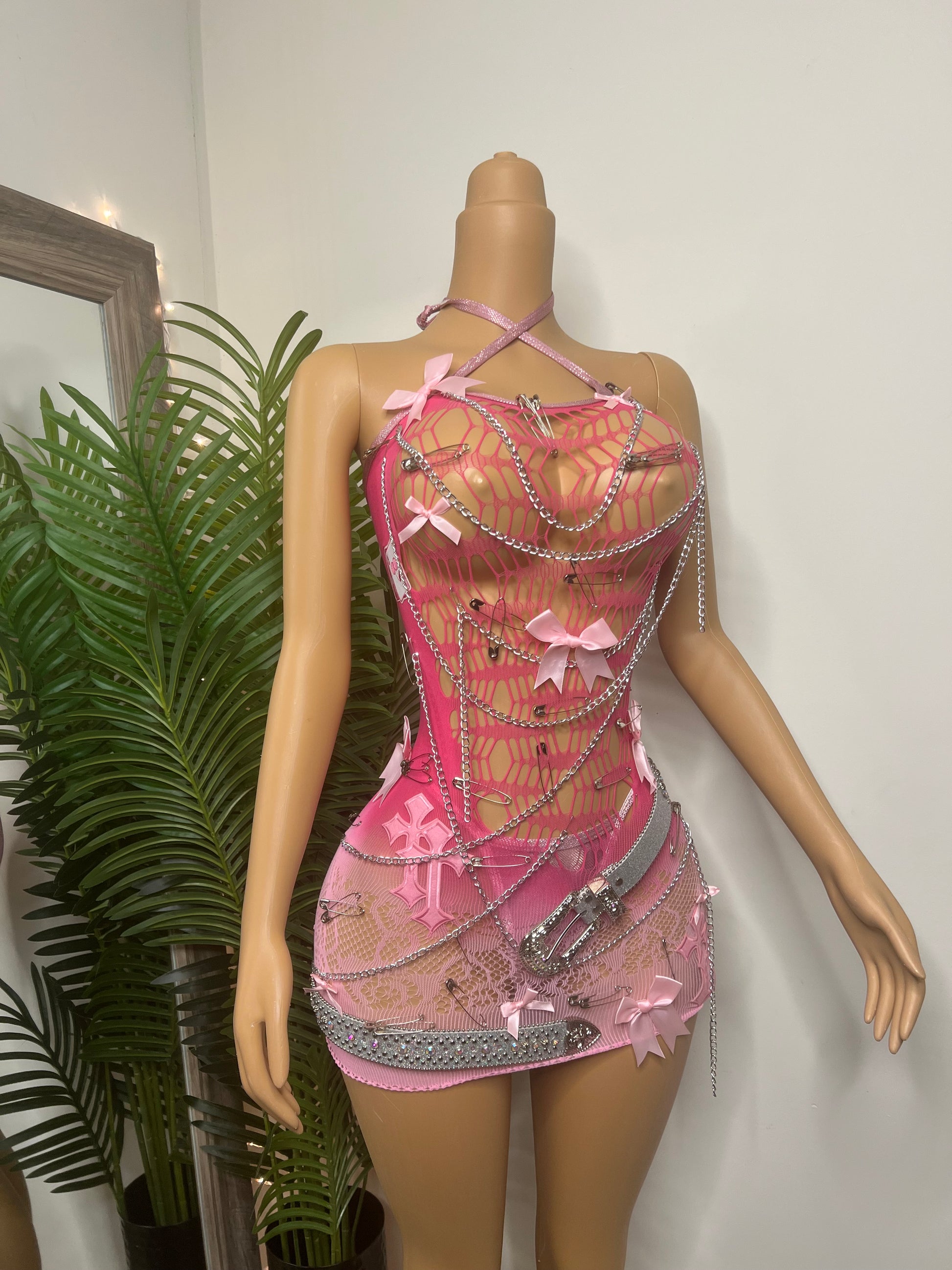 Candy Venom is a 1 of 1 reworked pink lace and fishnet dress featuring layered silver chains, safety pins, and satin bows. This handmade piece blends soft and edgy details for the perfect statement look.