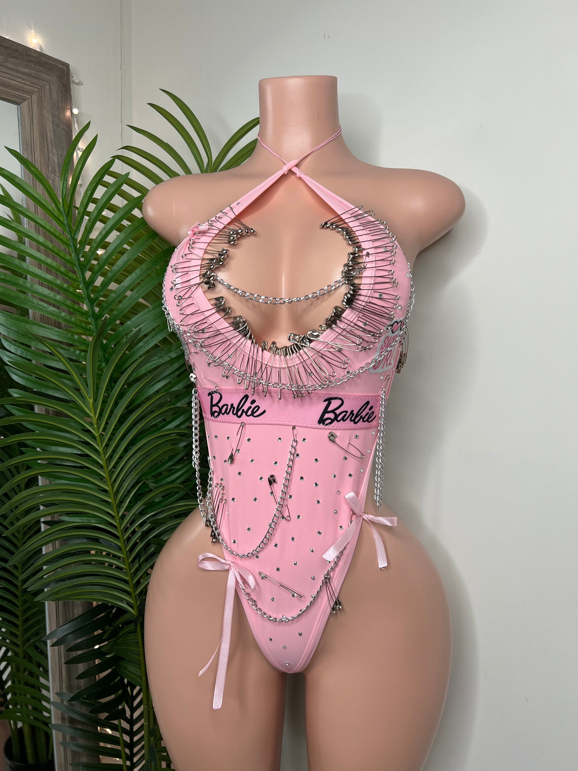 Chain Reaction One Piece is a bold pink statement bodysuit featuring silver safety pin detailing, layered chains, and rhinestone accents. Designed to hug the body with a sculpting fit and finished with edgy hardware details that catch the light from every angle.