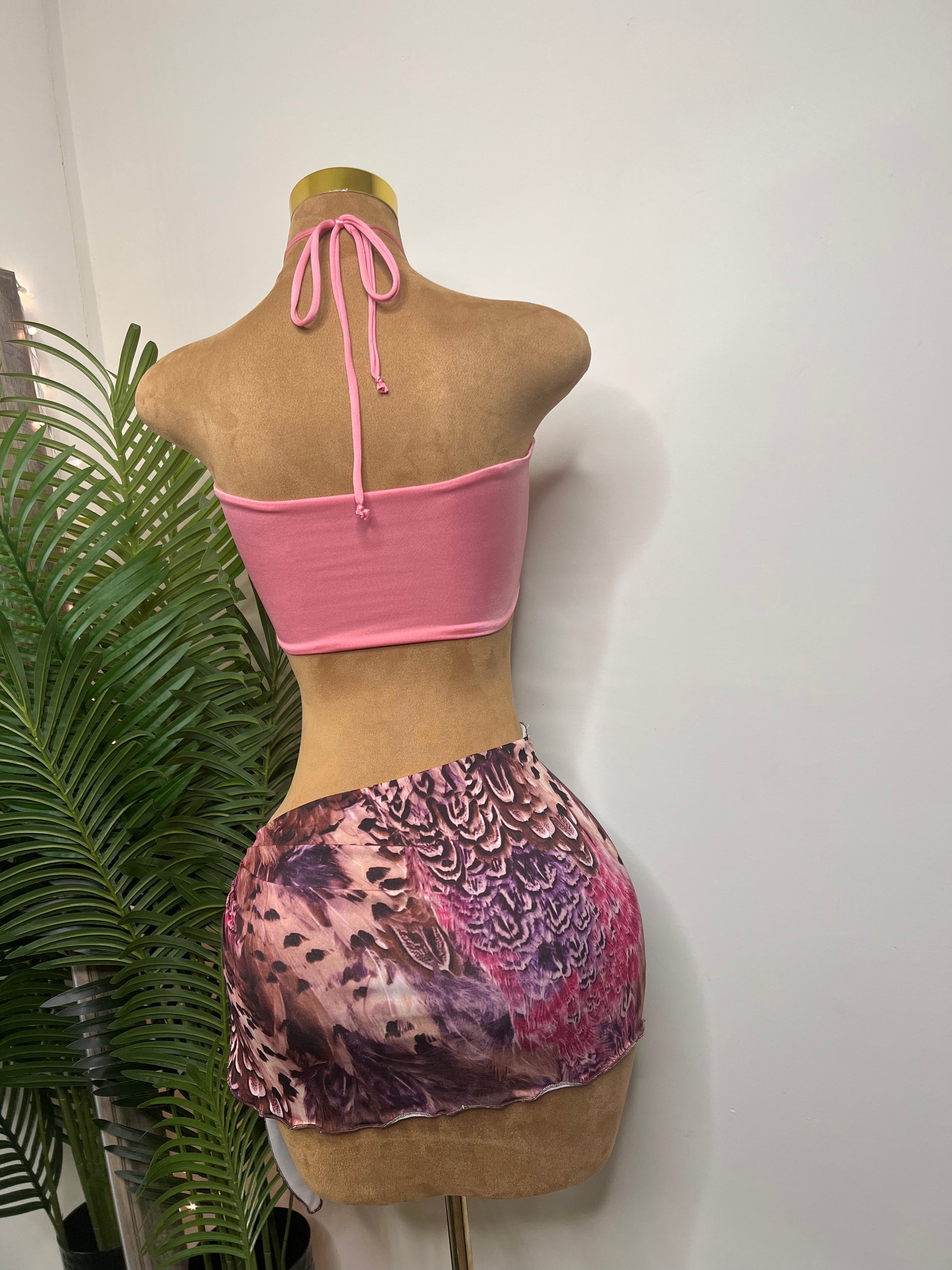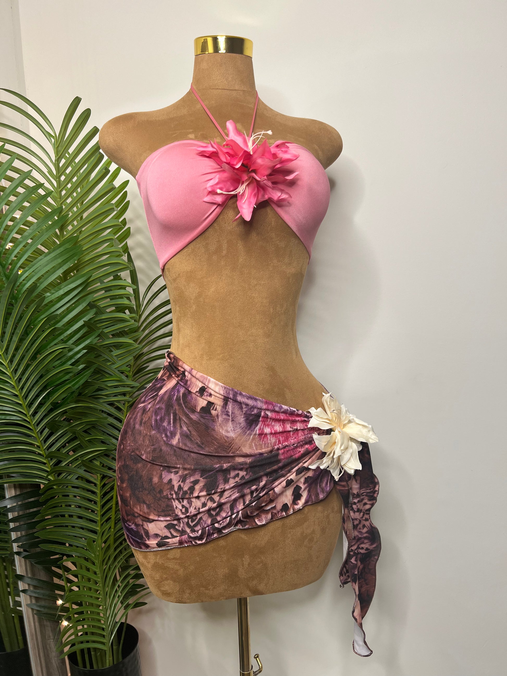 A soft-tropical two-piece featuring a pink bandeau top accented with a dramatic hand-placed flower centerpiece and a draped mesh sarong mini in sunset tones. The Island Bloom Set blends beach-ready ease with flirty resort energy, making it perfect for festivals, vacations, and warm-weather nights. Ready to ship and one of a kind.
