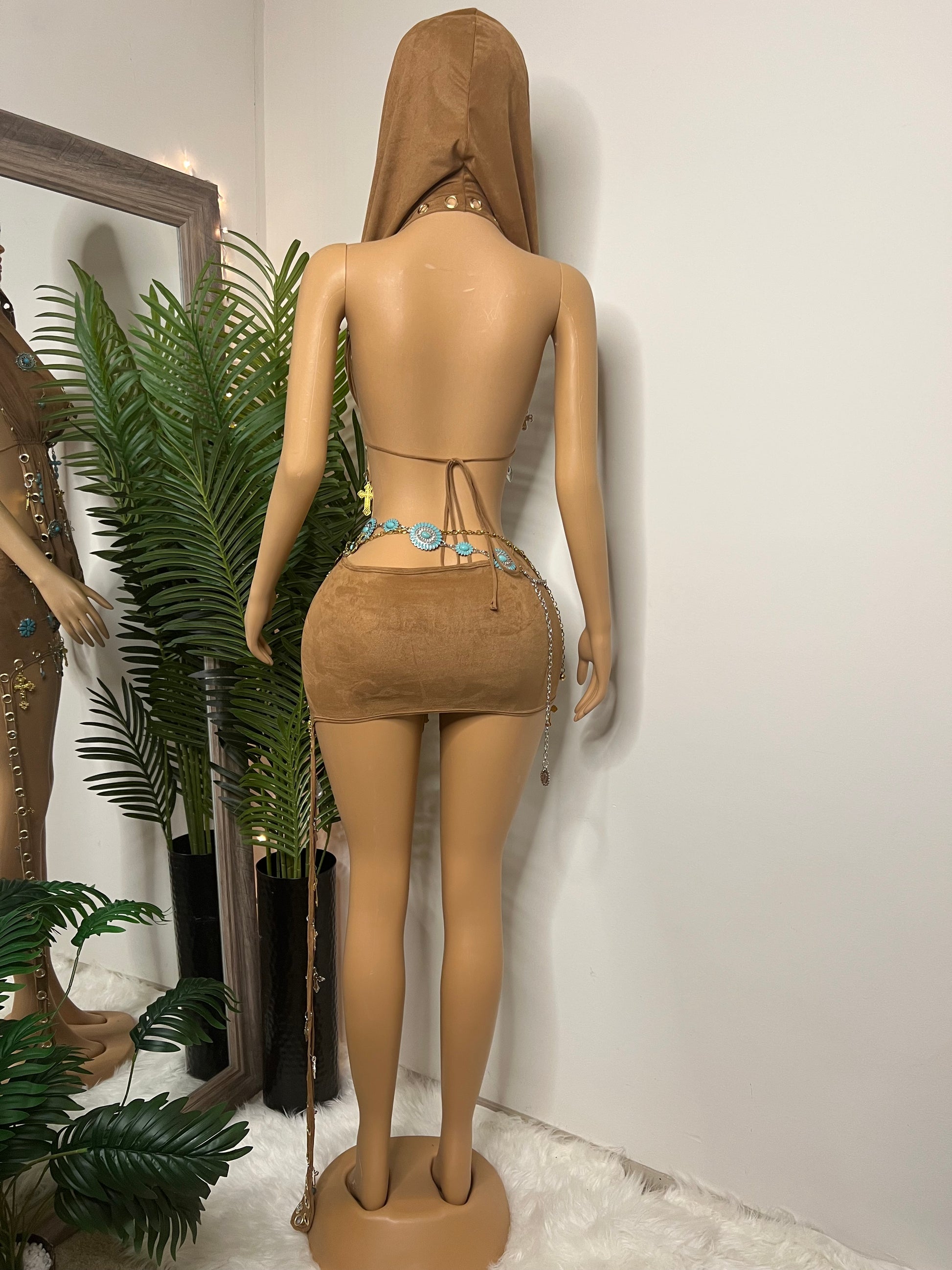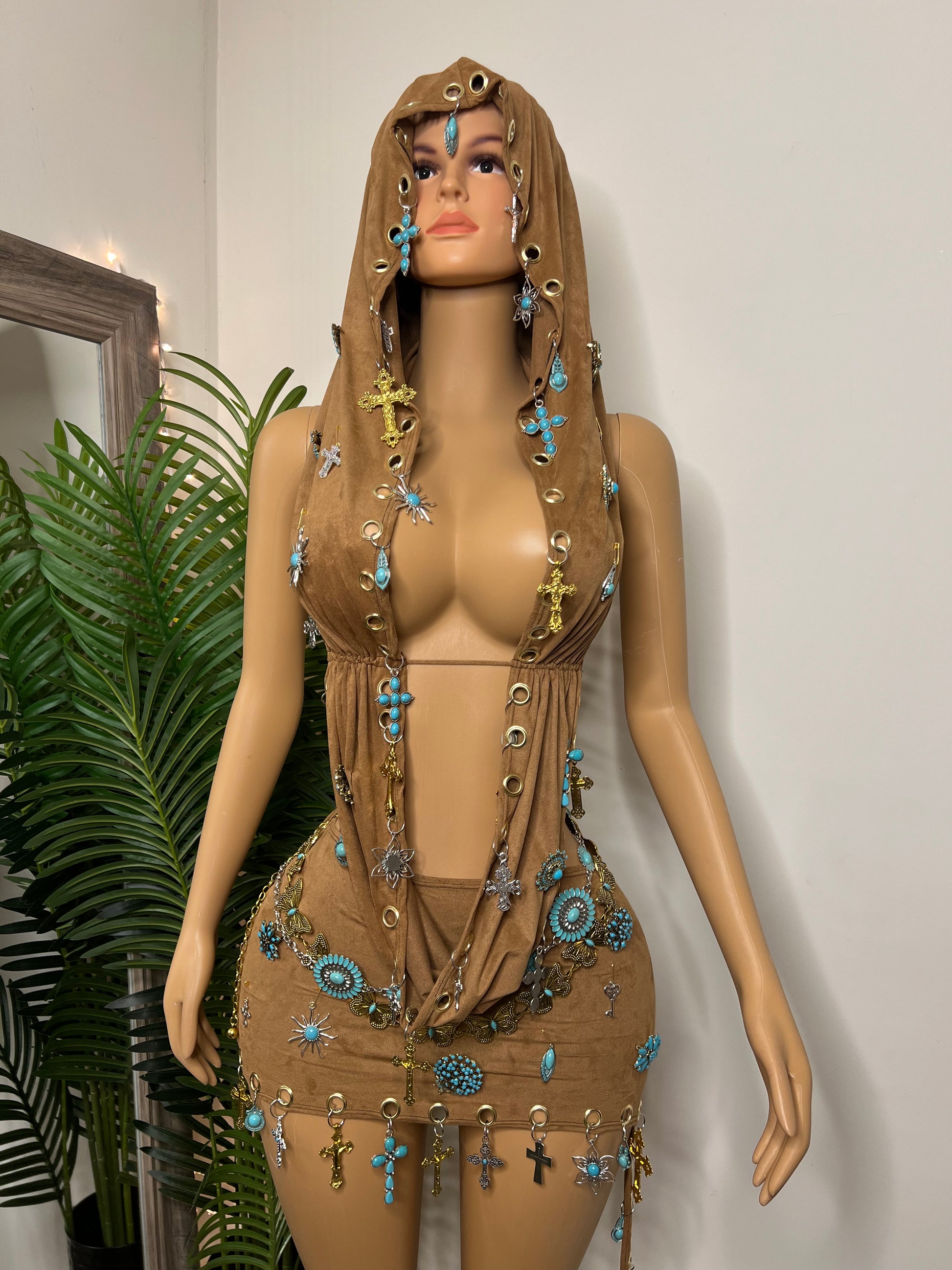 The Sacred Desert Dress is a divine fusion of ancient relic and modern temptation. Crafted from rich tan stretch suede, this hooded silhouette drapes effortlessly over the body — adorned with turquoise jewels, cross charms, and metallic relics that tell a story of power and devotion.